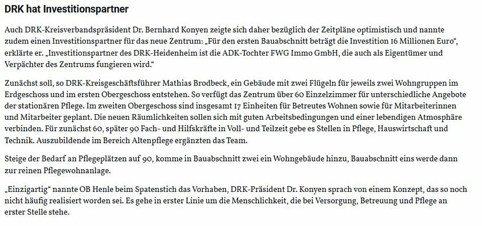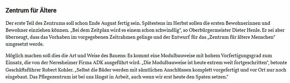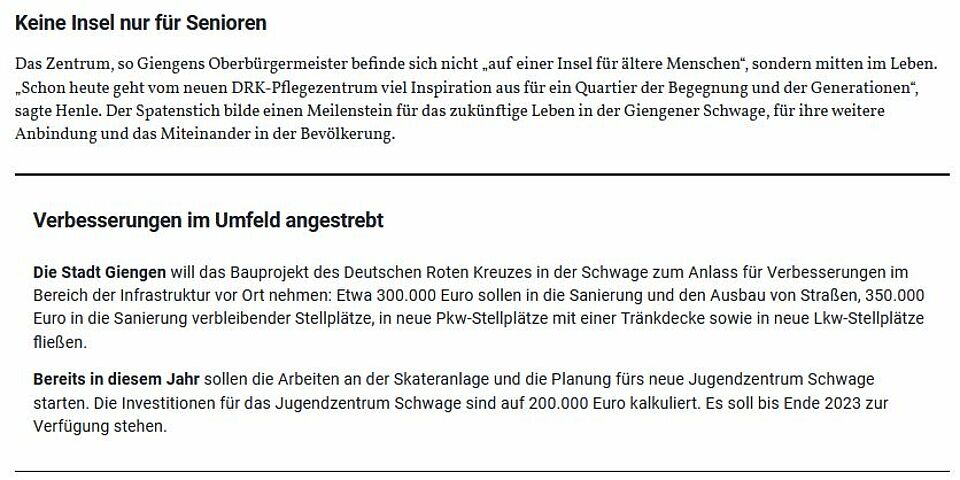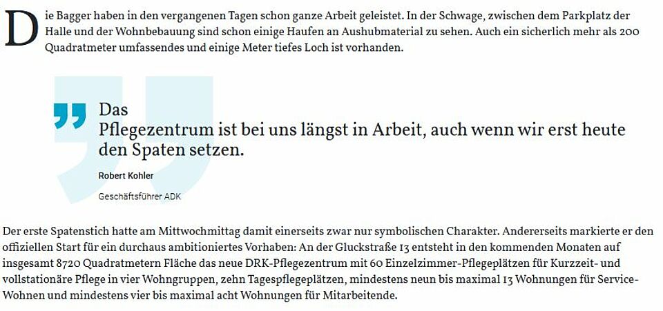 Schon im Herbst sollen die ersten Bewohnerinnen und Bewohner in der Schwage einziehen können. Die Investition für den ersten Abschnitt beträgt 16 Millionen Euro. Zunächst gibt es 60 Pflegeplätze (HZ v. 20.01.22).