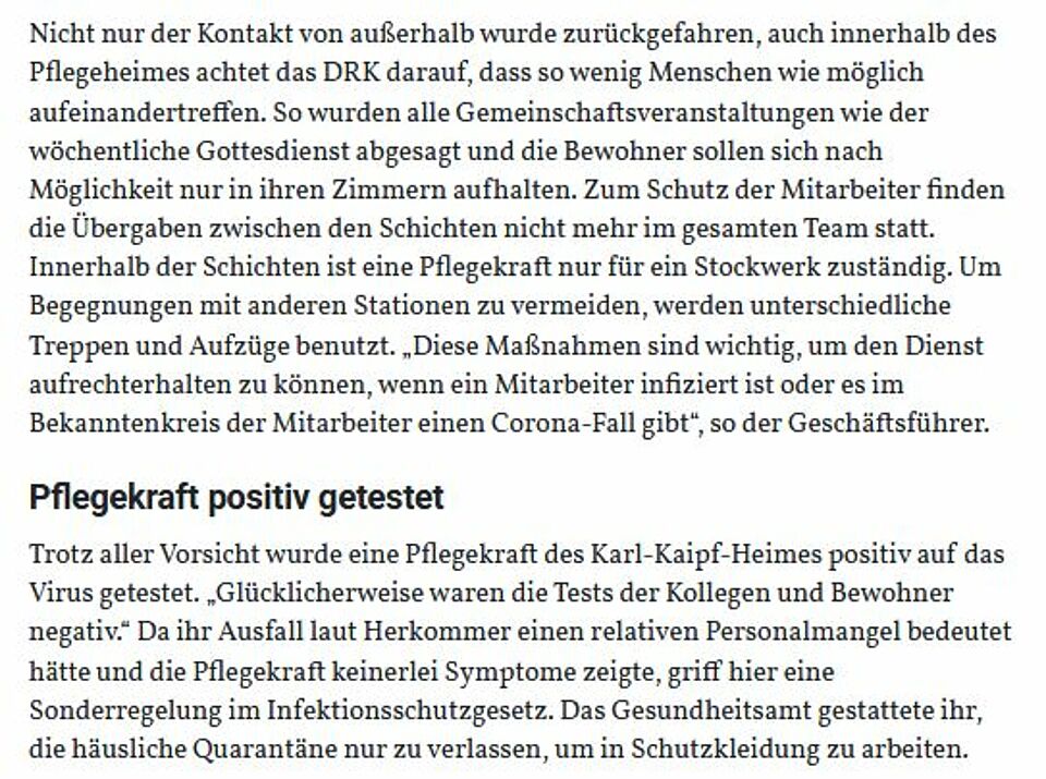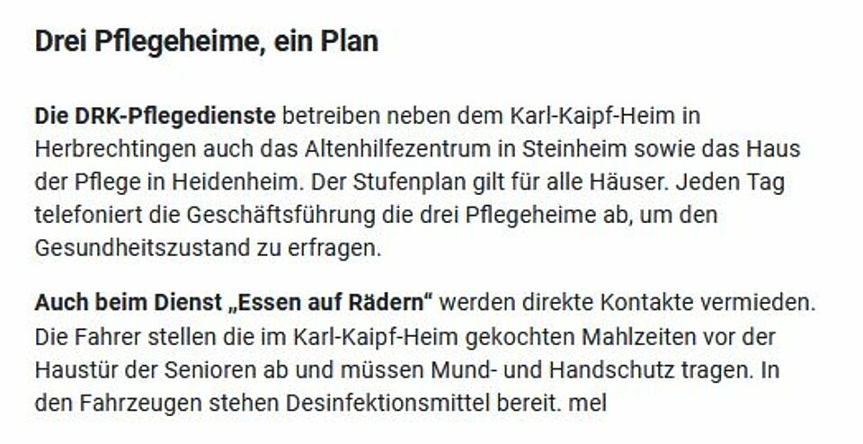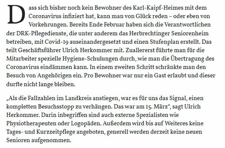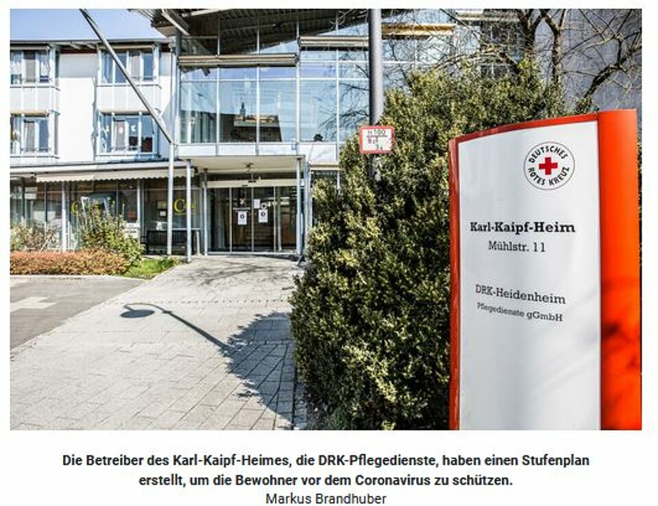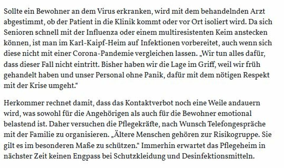 Senioren gehören zur Risikogruppe. Im Kampf gegen das Virus greift das Karl-Kaipf-Heim in Herbrechtingen daher zu besonderen Maßnahmen (HZ v. 08.04.20).