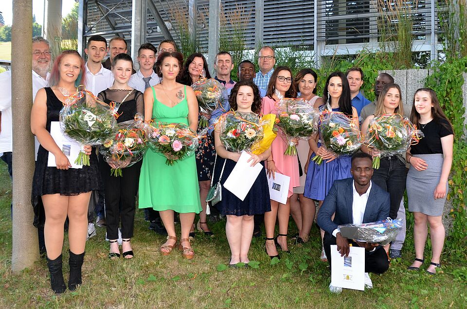 Neun haben ihre Ausbildung als Altenpfler/Altenpflegerin erfolgreich absolviert. Sieben der Absolventen werden die Teams in den drei DRK Pflegeeinrichtungen, dem Haus der Pflege in Heidenheim, dem Karl-Kaipf-Heim in Herbrechtingen und dem Altenhilfezentrum Im Olgagarten in Steinheim, verstärken. Die acht examinierten Altenpflegehelfer werden alle ihre Ausbildung fortsetzen, um auch die Anerkennung als Pflegefachkraft zu erlangen. Unser Bild zeigt von links nach rechts Geschäftsführer Ulrich Herkommer, Annalena Barchet (APH, HdP, Preis), Arbi Cakoni (APH, HdP), Konstantin Wall (Heimleiter KKH und AHZ), Juliana Haas (AP, KKH), Lisa Knoll (AP, HdP), Peter Dell´Aquila (PDL HdP), Vivien Cieslak (AP, HdP, Preis), Erika Oesterle (AP, AHZ, Belobigung), Alfred Gabel (Verantwortliche Pflegefachkraft AHZ), Vicky Lee Gerlach ( APH, AHZ, Preis), Wafik Tschedre (APH, HdP, Belobigung), Geschäftsführer Mathias Brodbeck, Antonella Lo Monaco (AP, HdP, Belobigung), Tatjana Schröder (AP, HdP, Belobigung), Bjondina Hyseni (AP, KKH, Belobigung), Marcel Balkheimer (AP, HdP), Lamin Jaiteh (APH, KKH, Belobigung), Dorothea Oßwald (APH, KKH, Preis), Hanna Diettele (APH, HdP) und kniend Samsidim Jadama (APH, KKH, Belobigung). Auf unserem Bild fehlt Flora Ali (AP, HdP, Belobigung). Die DRK Heidenheim Pflegedienste gGmbH legt großen Wert auf die Ausbildung künftiger Pflegefachkräfte. In allen Einrichtungen stehen zur Begleitung der praktischen Ausbildung freigestellte Praxisanleiterinnen zur Verfügung.