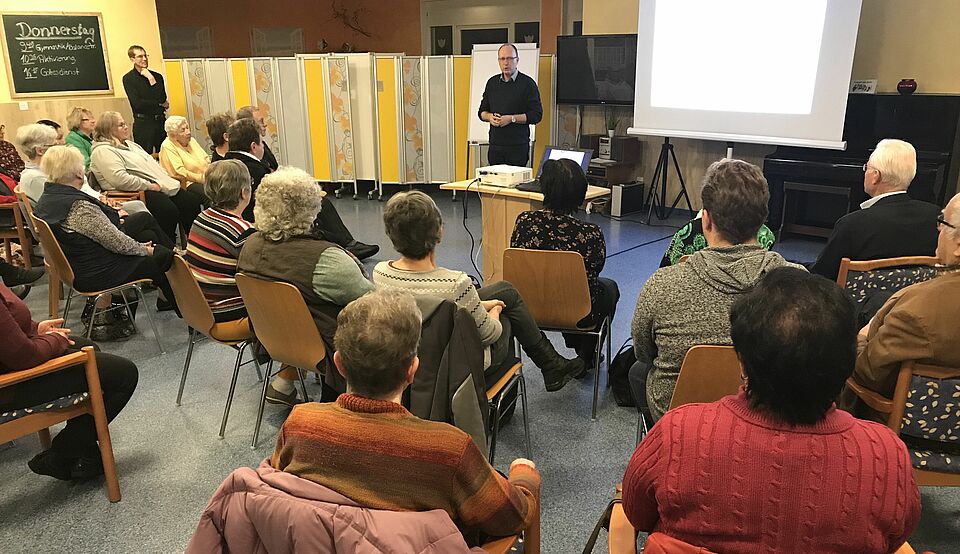 Unser Bild zeigt die Referenten Manfred Kiss und Dr. Andreas Schneider bei ihrem Vortrag im Haus der Pflege.