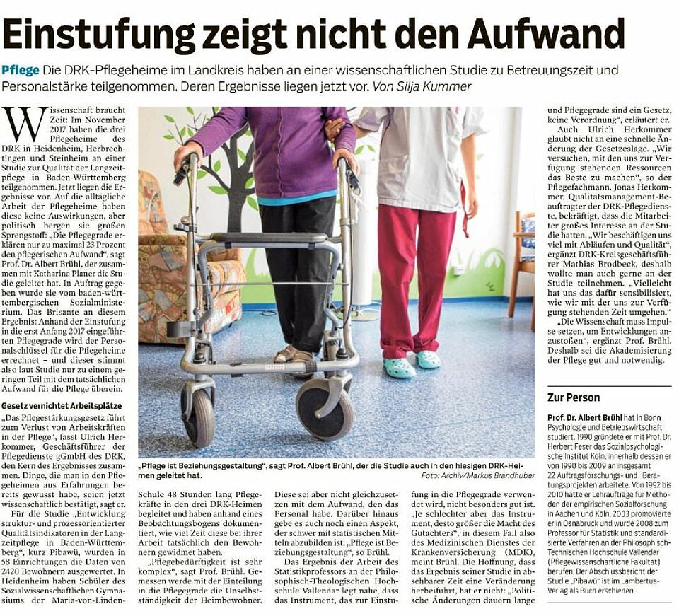 Die DRK Pflegeheime haben im Landkreis an einer wissenschaftlichen Studie zu Betreuungszeit und Personalstärke teilgenommen. Deren Ergebnisse liegen jetzt vor (HZ v. 23.03.19).
