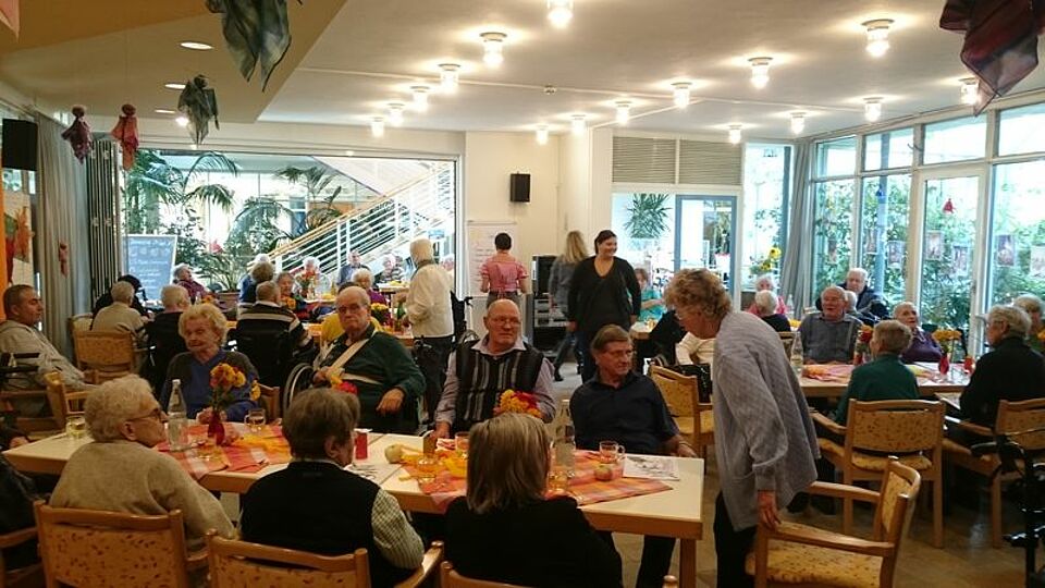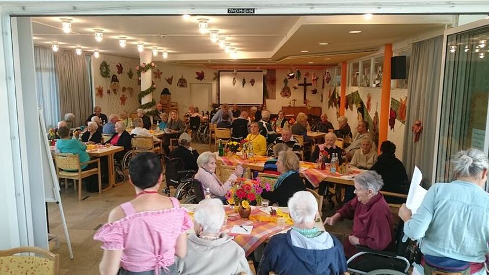 Im vollbesetzten, farbenfroh herbstlich geschmückten Saal konnten alle Gäste herzlich willkommen geheißen werden. Zur Einstimmung zum Thema „Erntedank“ wurden dann die Lieder „Bunt sind schon die Wälder“ und „Heißa Kathreinerle“ gemeinsam kräftig gesungen. Herbstgeschichten und Gedichte von der Kartoffelernte und vom Apfel wurden sehr interessiert belauscht und erzeugten eine ganz besondere herbstliche Stimmung. Die Herbrechtinger Landfrauen animierten die Anwesenden mit ihren schönen, instrumental begleitenden Vorträgen zum Mitsingen und Mitschunkeln. Mit Zwiebelkuchen und Neuem Wein wurden die Teilnehmer zur Kaffeezeit verwöhnt. Dank der guten Laune und Freude der Bewohner und auch der Besucher war es ein gelungener Nachmittag.