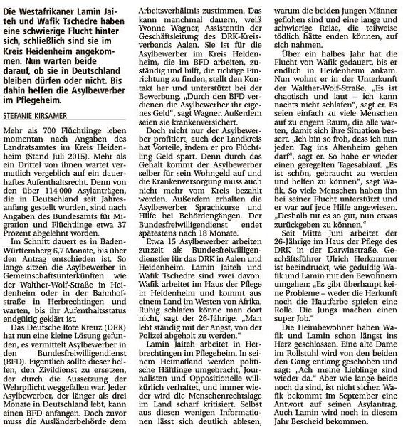 Asylbewerber können als Bundesfreiwilligendienstler im Pflegeheim arbeiten - zwei Flüchtlinge erzählen (Heidenheimer Zeitung v. 13.08.15)