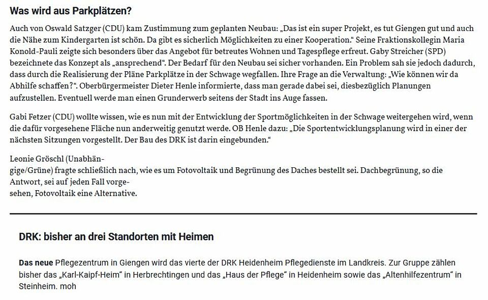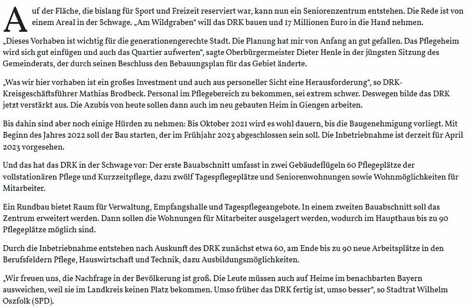 Das Rote Kreuz investiert für ein Pflegeheim in der Schwage 17 Millionen Euro. Die Stadträte sind von den Planungen angetan, der Bebauungsplan wurde geändert (HZ v. 01.10.2020)