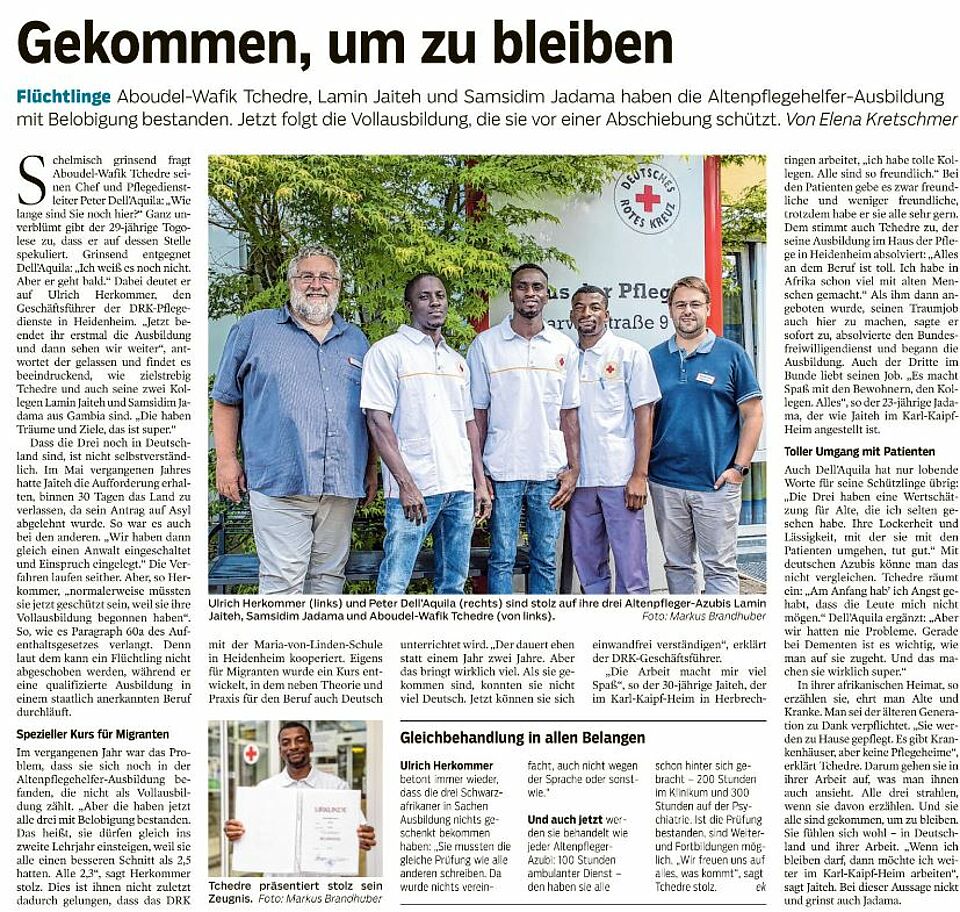 Aboudel-Wafik Tchedre, Lamin Jaiteh und Samsidim Jadama haben die Altenpflegehelfer-Ausbildung mit Belobigung bestanden. Jetzt folgt die Vollausbildung, die sie vor einer Abschiebung schützt (HZ v. 31.07.18).