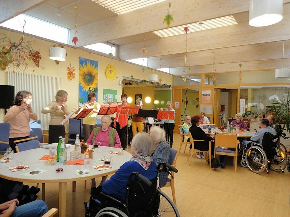 Beim diesjährigen Herbstfest im AHZ "Im Olgagarten" wurden die Heimbewohner und ihre Gäste von Erna Schmid und Franziska Schleich zu einem „Waldspaziergang“ eingeladen. Mit einer Bewegungsgeschichte machten sich alle auf den Weg. Es wurden Lieder gesungen, Geschichten vorgelesen und Tiere erraten. Eine Rast mit Zwiebelkuchen und Neuem Wein, die musikalisch von Hans Fetzer am Akkordeon und Josef Kotitschke mit der Gitarre begleitet wurde, durfte natürlich nicht fehlen. Dann gab es noch ein Konzert der Steinheimer Musikschule. Schülerinnen spielten auf dem Klavier und der Gitarre und das Querflöten-Ensemble lud mit Herbstliedern zum Mitsingen ein. Mit einer Entspannungsgeschichte wurde der Waldspaziergang beendet.