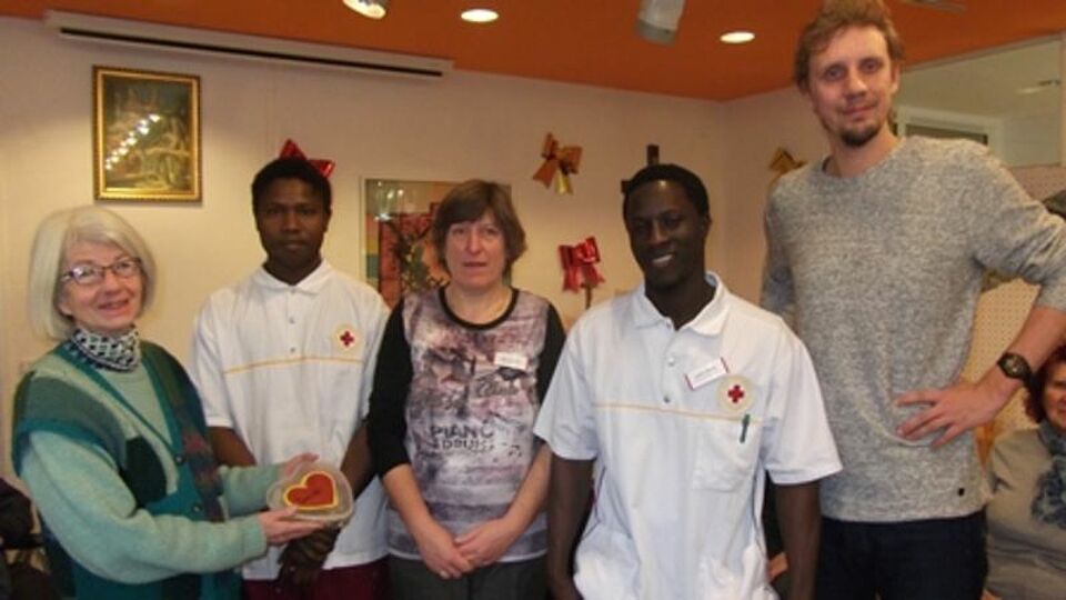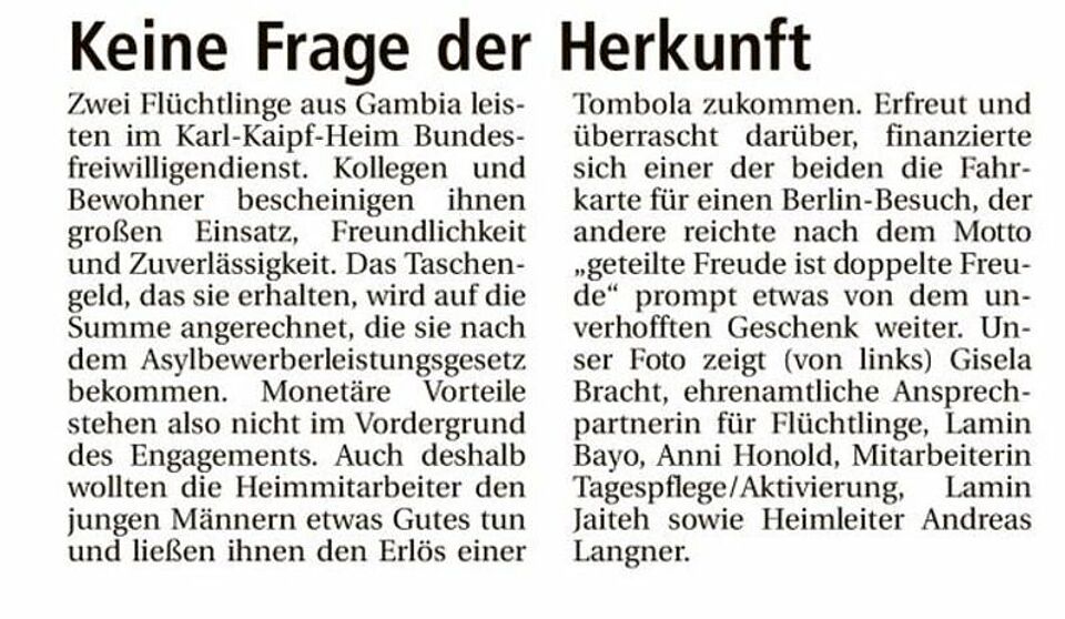Foto: (von links) Frau Gisela Bracht, Ehrenamtliche Ansprechpartnerin für Flüchtlinge, Herr Lamin Bayo, Helfer im Bundesfreiwilligendienst, Karl-Kaipf-Heim, Frau Anni Honold, Mitarbeiterin Tagespflege/Aktivierung, Karl-Kaipf-Heim, Herr Lamin Jaiteh, Helfer im Bundesfreiwilligendienst, Karl-Kaipf-Heim, Herr Andreas Langner, Heimleiter, Karl-Kaipf-Heim