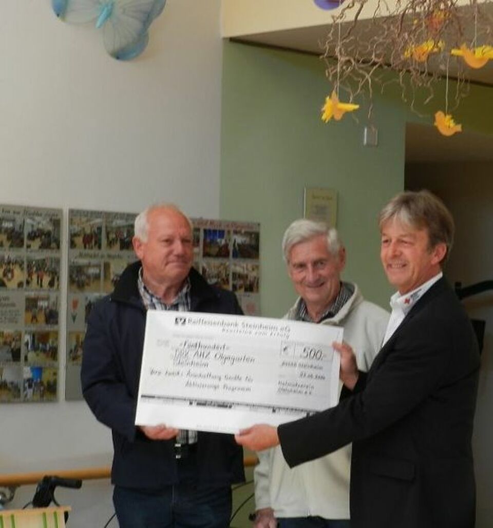 Herr Rudolf Maier und Herr Hans Hommel vom Heimatverein Steinheim übergaben Heimleiter Bernhard Wührl vom DRK Altenhilfezentrum Im Olgagarten in Steinheim einen Scheck in Höhe von 500 Euro. Mit dieser großzügigen Spende unterstützt der Heimatverein die Aktivierung/Tagespflege im Altenhilfezentrum, die Sinneswände für den Aktivierungsbereich angeschafft hat. Das DRK Altenhilfezentrum Im Olgagarten bedankt sich recht herzlich für die Spende!