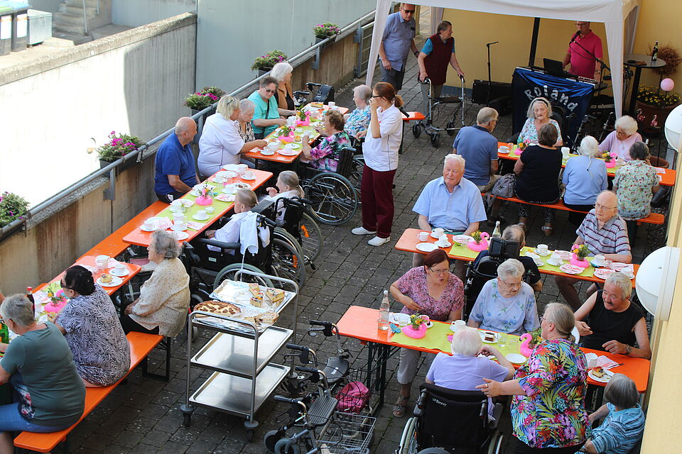 Unter musikalischer Begleitung konnten unsere Bewohner gemütlich auf der Terrasse oder im Haus ihren Kaffee und Kuchen genießen. Anschließend durfte sich jeder auf unserer Spielstrasse auspowern, um sich dann wieder mit Gegrilltem zu stärken.